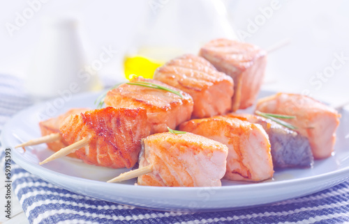 red, pan, dish, meal, peel, fish, food, stick, slice, fried, plate, white, snack, lunch, fresh, baked, image, salmon, nobody, orange, dinner, skewer, served, closeup, chopped, paprika, epicure, roasted, grilled, healthy, cookery, seafood, bar-b-q, prepared, rosemary, colourful, delicious, decorated, vegetable, starfish, horizontal, fishing net, mediterranean