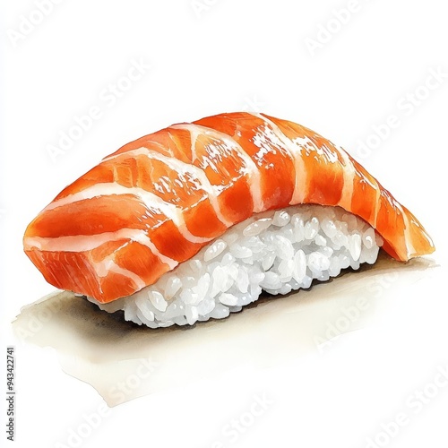 Salmon nigiri, glossy fish over vinegared rice, subtle shine, elegant simplicity, warm tones, Watercolor style