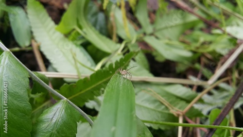 Salticus sceneryus or spider jumping on the leaves. Shot in the forest.