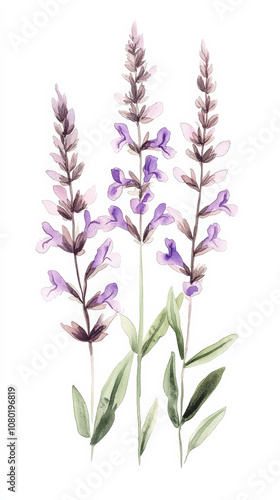 Salvia Sage detailed hand drawn pastel watercolor botanical image, medicinal herbs, light background. Generative AI