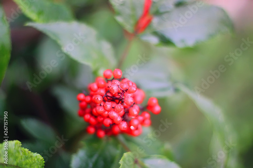 Sambucus racemosa, common red elderberry, red-berried elder berries on the branch in the garden.
