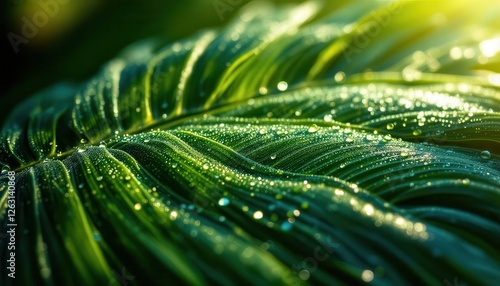 leaf, droplet, water, glistening, closeup, vein, texture, detailed, organic, natural, fresh, dew, wet, bright, green, tropical, flora, foliage, plant, growth, macro, surface, pattern, shining, sparkling, botany, environment, botanical, summer, spring, detail, background, nature, vibrant, wellness, refreshing, green leaf