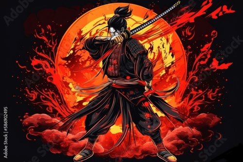 Samurai warrior with katana. Sun fire background. Generate Ai