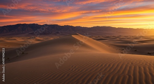 Sand dunes under a colorful sunset sky, desert landscape photography, travel and tourism, nature background