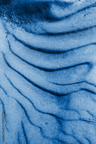 sand pattern of a beach close-up in the summer. Classic blue Pantone color the year 2020. vertical image