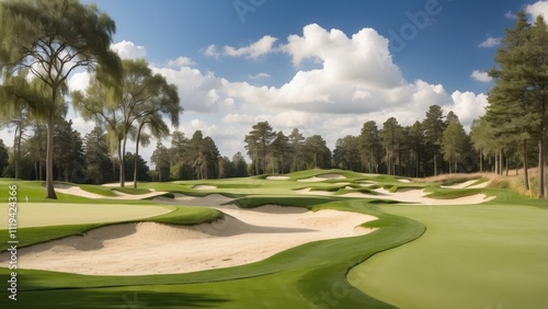 golf, grass, green, course, landscape, field, nature, sky, tree, tree, blue, sport, golf course, fairway, summer, park, lawn, flag, outdoors, game, meadow, cloud, club, beautiful, leisure