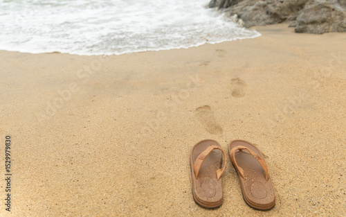 Sandals in the beach. Enjoying freedom and life, people travel wellbeing concept.