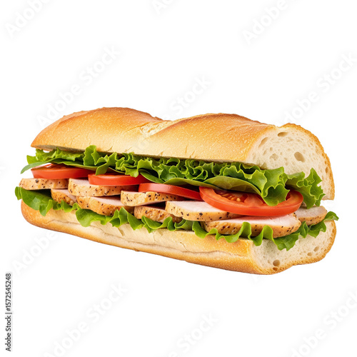sandwich, food, bread, chicken, isolated, white, transparent, cut-out, meat, salad, tomatoes, closeup, slice, lettuce, meal, breakfast, snack, fresh, baguette, france, french