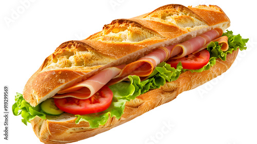 Sandwich with ham, cheese, tomatoes, lettuce, and toasted bread. Side view isolated on transparent background.