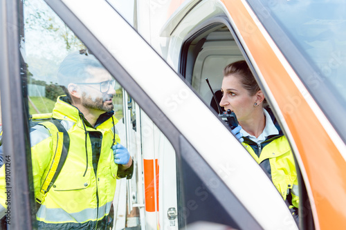Sanitäter im Rettungswagen funken mit Einsatzleitung zum Einsatz