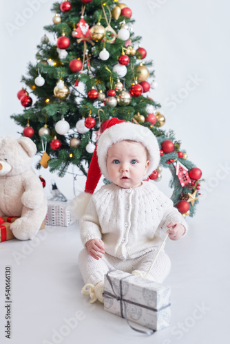 Santa baby. Christmas tree background. Happy New Year! Child in Santa's hat.
