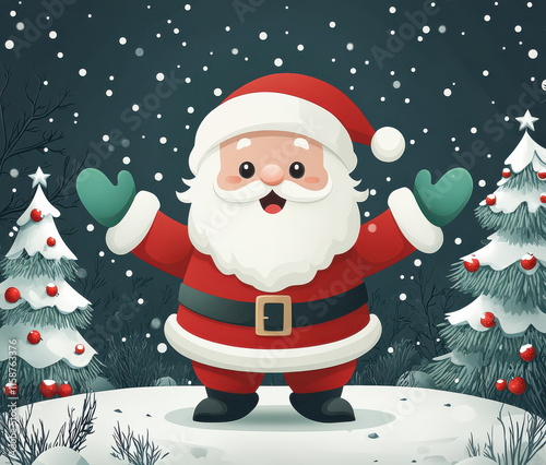 Santa Claus, Cartoon-style Illustration, Red Suit, Green Mittens, Snowy Landscape, Festive Scene, Commercial Christmas Content