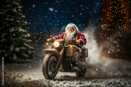 Santa Claus drives fast in motorcycle full of gifts on winter road. delivery concept, sale