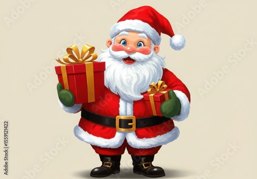 santa, claus, christmas, present, holiday, gift, winter, beard, character, illustration, december, celebration, festive, season, joy, cheerful, holding, wrapped, with, gold, ribbon, wearing, traditional, suit, white, glove, spreading, art