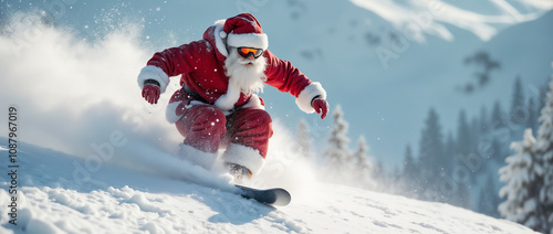 Santa Claus is joyfully snowboarding down a pristine snowy mountain slope, surrounded by winter scenery. Capturing the spirit of Christmas adventure and holiday fun in the outdoors.