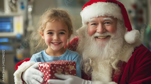 smiling, children, pose, santa, holding, gift, hospital, setting, christmas, health care, pediatric, patient, cheerful, happy, festive, season, holiday, winter, december, medicals, care, nurse, doctor, joy, love, compassion, kindness, generosity, hope, gratitude, visit, candy cane, white beard, jolly, toy, present, magical, celebration, laughter, fun, santa, happiness, claus