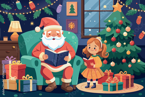 christmas, santa, reading, girl, tree, gift, holiday, winter, celebration, new year, season, december, traditional, family, home, cosy, indoor, festive, cartoon, art, character, children, book, present, decoration, room, evening, story