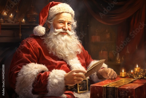 Santa Claus reads a letter of wishes in postcard style. Merry christmas and happy new year concept