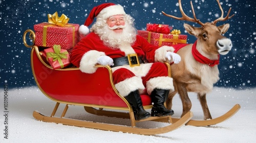 Santa Claus rides a festive sleigh with presents, accompanied by a reindeer in a winter wonderland setting filled with snow.