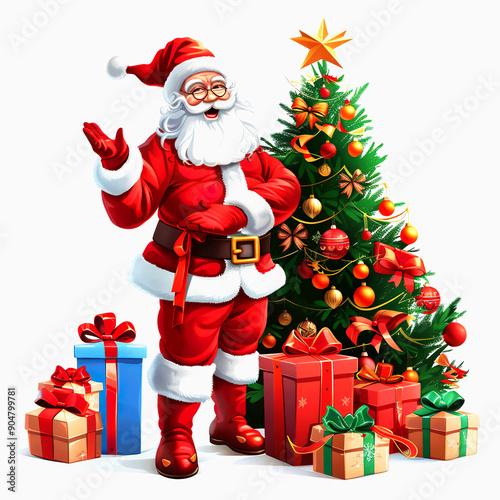 Santa Claus Standing Beside a Decorated Christmas Tree with Presents