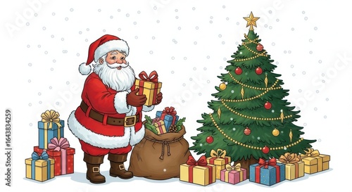 santa, christmas, tree, gift, bag, present, holiday, season, winter, snow, celebration, joy, happy, family, tradition, magic, spirit, cheer, festive, greeting, card, drawing, art, character, figure, man, beard, red, suit