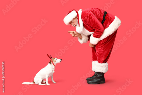 Santa Claus with cute Jack Russell Terrier dog in reindeer horns on red background