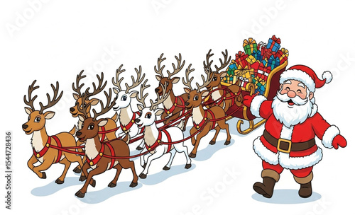 santa, santa, reindeer, sleigh, christmas, winter, holiday, snow, festive, christmas, december, gift, present, fun, cartoon, illustration, isolated, white background, cute, happy, merry, joyful, red, costume, smile, vector, north pole, traditional, celebration, season, character, animal, cheerful, greeting, card, magical