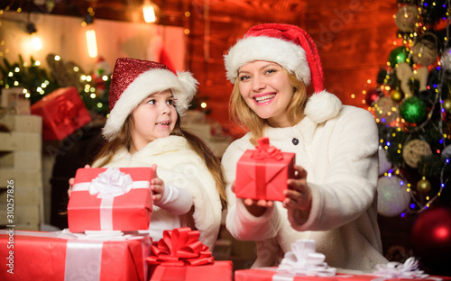 Santa, please stop here. Happy family celebrate new year. xmas gift. Open present. merry christmas. mother and daughter love holidays. small child girl with mom in santa hat. Winter shopping sales