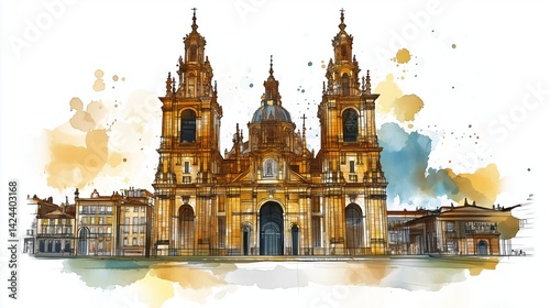 galicia, santiago, compostela, cathedral, great, spain, church, basilica, watercolor, watercolor, illustration, painting, background, design, destination, element, hand-drawn, holiday maker, isolated, landmark, landscape, tour, tour tourism, travel, white