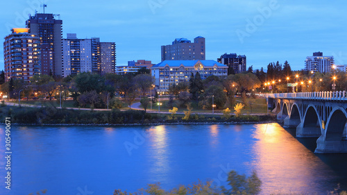 night, twilight, dusk, evening, autumn season, autumn trees, autumn leaf, fall, autumn, city, downtown, skyline, building, canada, urban, saskatchewan, city landscape, river, architecture, skyscraper, blue, water, structure, hotel, landmark, south, river bank, bridge, sky, historic, tour tourism, travel, nature, tree
