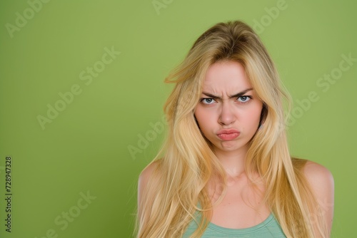 Sassy Young Blonde Woman on a Solid Lime Green Background. Generative AI.
