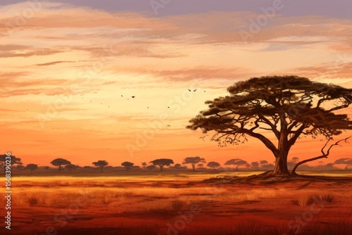 tranquil scene, orange color, rural scene, single tree, calmness, background, landscape, outdoors, savanna, digital, horizon, prairie, savanna, scenery, animal, desert, nature, safari, sunset, cloud, field, kenya, plain, plant, bird, land, tree, art, sky