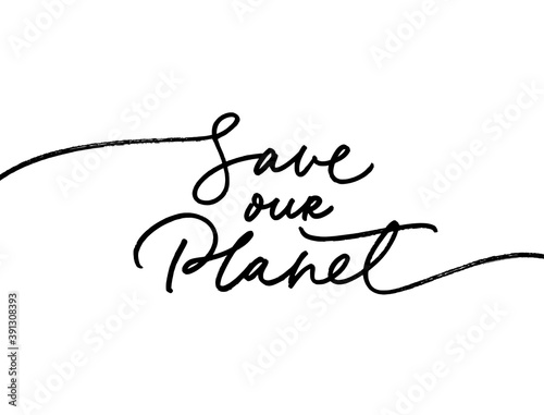 Save our Planet line style calligraphy. Modern vector holiday lettering. Earth Day typography design with swooshes for greeting cards and poster. Environmental and eco activism concept