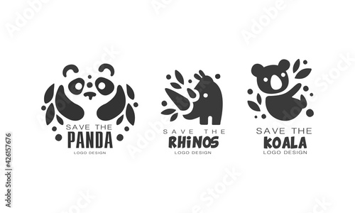 Save Wild Animals Logo Design Set, Protection of Panda, Rhino, Koala Animals Black and White Badges Vector Illustration