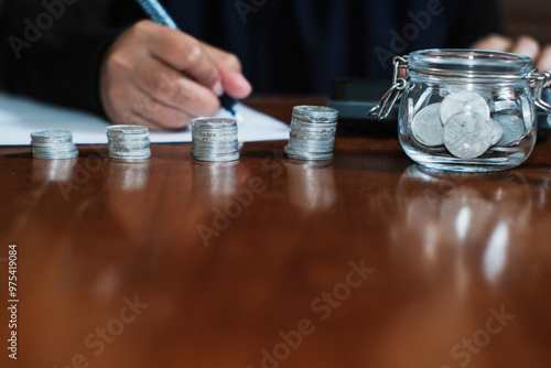 Saving concept with pile of the coins and coins on the jar glasses and a hand holding pen taking note the amount of money with calculator in the wooden table, Savings and investing concept.