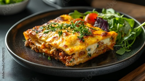 Savor an Elegant Plate of Beef Lasagna with Layers of Flavor and a Fresh Side Salad