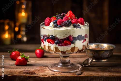 Savor the essence of Cranachan, tastefully presented on a wooden table. This delightful dessert captures the richness of cream, oats, and berries in a harmonious blend.