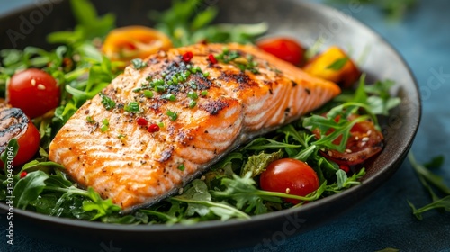 Savor the flavors of a perfectly grilled salmon fillet, topped with herbs, resting on a fresh bed of arugula and garnished with vibrant cherry tomatoes, perfect for a summer feast