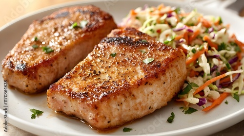 pork meat, chop, crispy, coleslaw, zesty, dinner, family, meal, savoury, taste, comfort, cooking, presentation, life events, appetising, delightful, satisfaction, culinary, affordable, nourishing, social, togetherness, favor, fusion, exploration, tenderness, dining