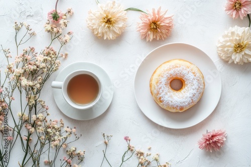 Savoring a coconut donut in a cozy tea setting vibrant floral decor food photography warm & inviting atmosphere