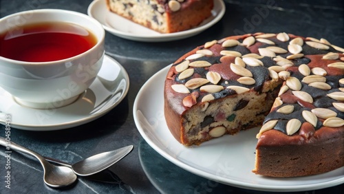 Savoring a slice of rich dundee cake with almonds in a cozy tea room a perfect blend of flavor and comfort