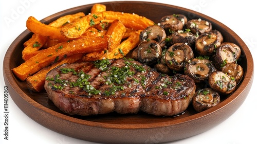 Savoring a Steak Dinner on Dark Wood Platter Presentation on White Background Culinary Delight Gourmet Cuisine Close-Up Gastronomy