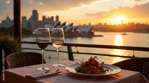 savoring exquisite food and wine while overlooking iconic Sydney Harbour, dining with a panoramic view with sun casting a golden glow over cityscape, creating a breathtaking scene that perfectly cap