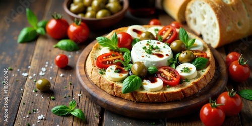 Savory Artisan Bread Topped with Creamy Cheese, Burst Cherry Tomatoes, and Briny Olives, Dressed with a Zesty Vinaigrette