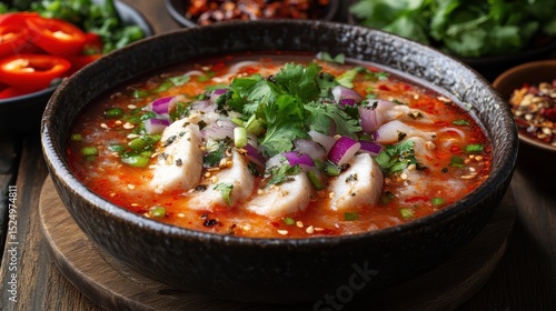 asian, soup, herb, onion, fish, bowl, wooden, table, healthy, eating, gastronomy, culinary, meal, lunch, spicey, noodle, cookery, dinner, delicious, fresh, cilantro, scallion, chili, pepper, favor, broth, savoury, appetising, red, vegetable, background, dish, ingredient, closeup, rustic, dark, epicure, aromatic, cooking, food, plate, oriental, nourishment, diet, traditional, vibrant, texture, vitamin, colourful