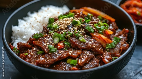 beef, rice, vegetable, lunch, dinner, meal, cookery, favor, asian, white rice, sesame, green onion, garnish, protein, tradition, food, serving, delicious, herb, spice, bowl, receipe, preparation, cooking, ingredient, hot, homemade, comfort, eating, alimentary, plating, background, culinary, dining, tasty, appetising, vibrant, colourful, eatery, epicure, simple, delightful, closeup, freshness, hearty, enticing, table, warmth