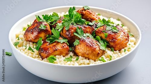 Savory chicken on couscous, topped with vibrant green herbs for a delicious presentation