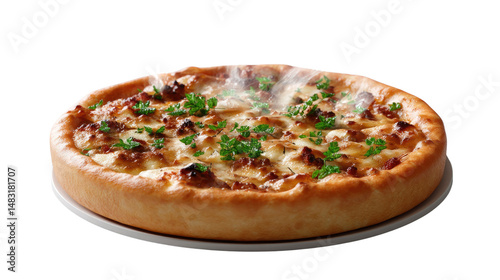 Savory Deep-Dish Delight: A freshly baked deep-dish pizza rests invitingly on a clean plate, the steaming center promising an explosion of flavor and culinary delight.