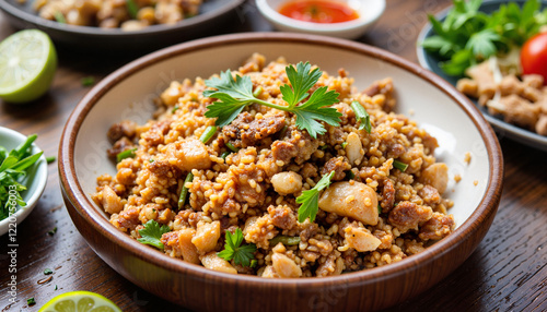 Savory Filipino sisig served in ceramic bowl on casual dining table, flavorful cuisine