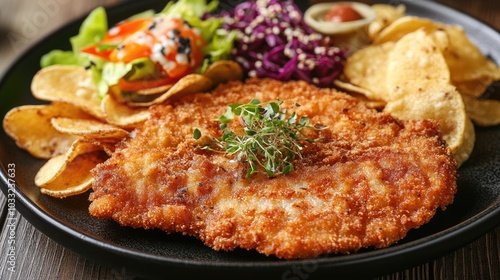 savoury, fried, meat, cutlet, plate, stylish, food, meal, cookery, dish, garnish, vegetable, salad, chips, crispy, presentation, appetising, dining, eatery, culinary, kitchen, favor, texture, colourful, fresh, healthy, herb, ingredient, platter, epicure, indulgent, side, accompaniment, fork, knife, life events, homemade, comfort, lunch, dinner, snack, sharing, serving, detail, vibrant, delicacy